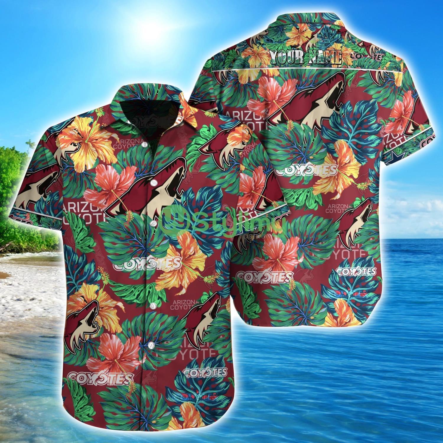 Designed with the iconic Arizona Coyotes logo, this Hawaiian shirt is a must-have for any fan. The custom name feature allows you to personalize it with your own name or the name of your favorite player, making it a truly unique and special piece.