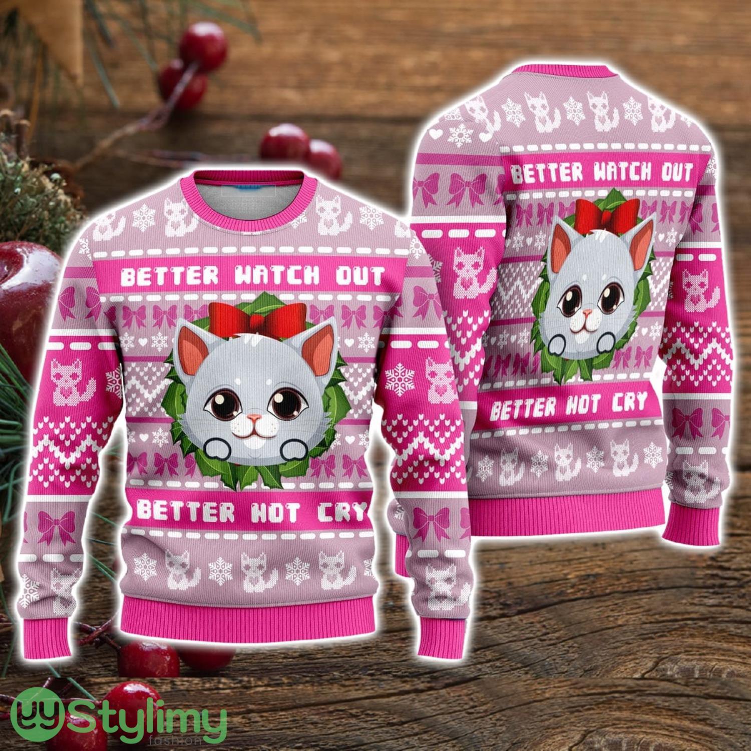 Better Watch Out Better Not Cry Pink Cat Ugly Christmas Sweater Christmas Holiday Gift For Men And Women Product Photo 1