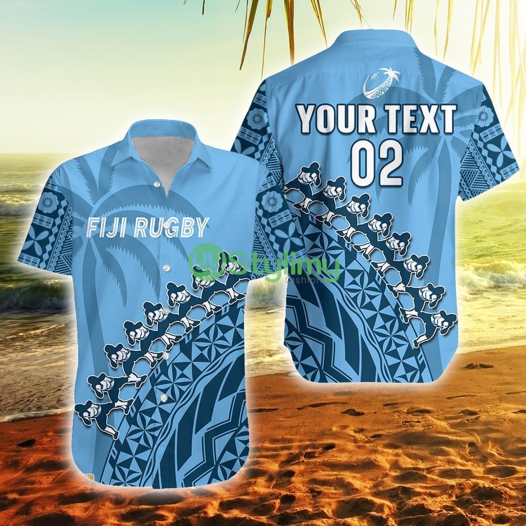 Custom Name And Number Fiji Tapa Rugby Fijian Cibi Dance Tapa Pattern Blue Fiji Button Down Hawaiian Shirt Trending Summer Details: