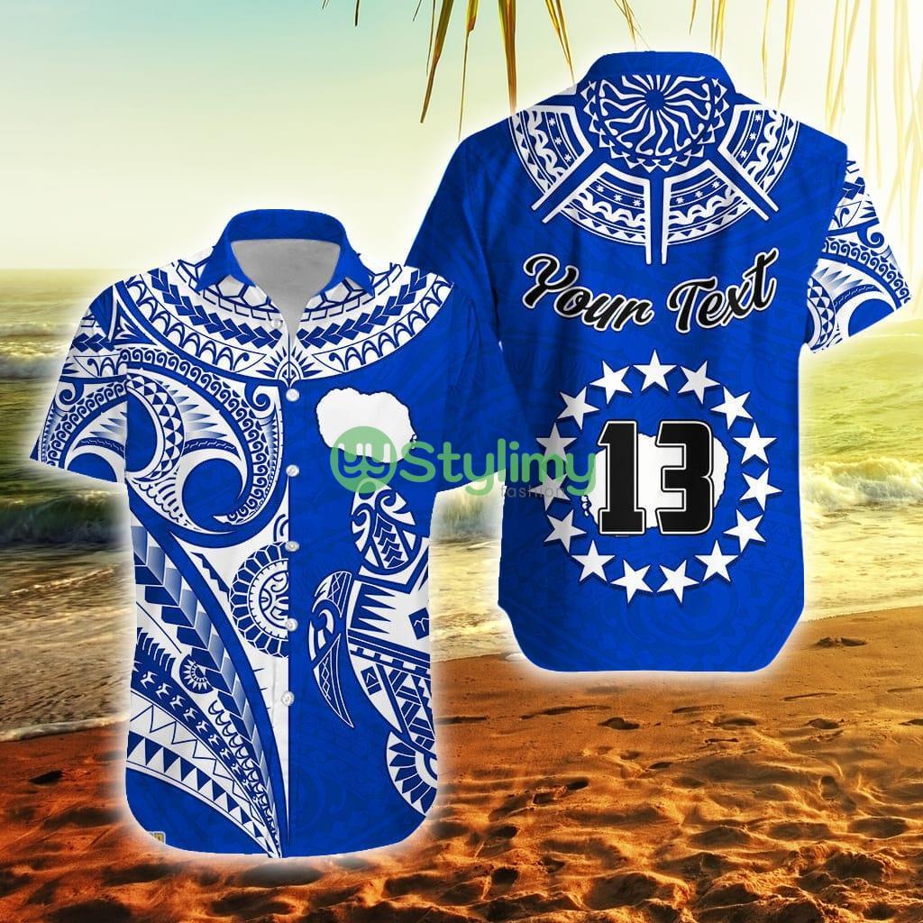 Custom Name And Number Rarotonga Cook Islands Turtle And Map Style Blue Cook Islands Button Down Hawaiian Shirt Trending Summer Details: