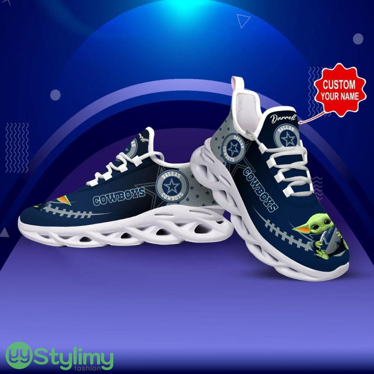 Show your love for the Dallas Cowboys with these one-of-a-kind NFL Max Soul Shoes! Customized with your name and featuring a unique Yoda design, these running sneakers are the perfect gift for any football fan and Star Wars lover. Stand out from the crowd and support your favorite team in style with these exclusive kicks. Order yours today and hit the streets in true Cowboys fashion!