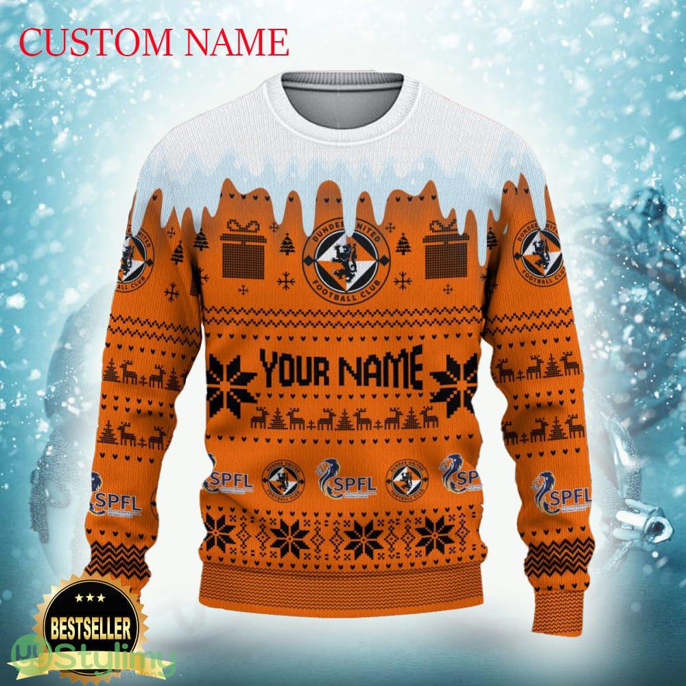 What sets this sweater apart is the option to personalize it with your own custom name. Add your name, your loved one’s name, or even your favorite player’s name to make this sweater truly one-of-a-kind. It’s a fantastic way to showcase your unwavering support for Dundee United FC while embracing the joy of the holiday season.