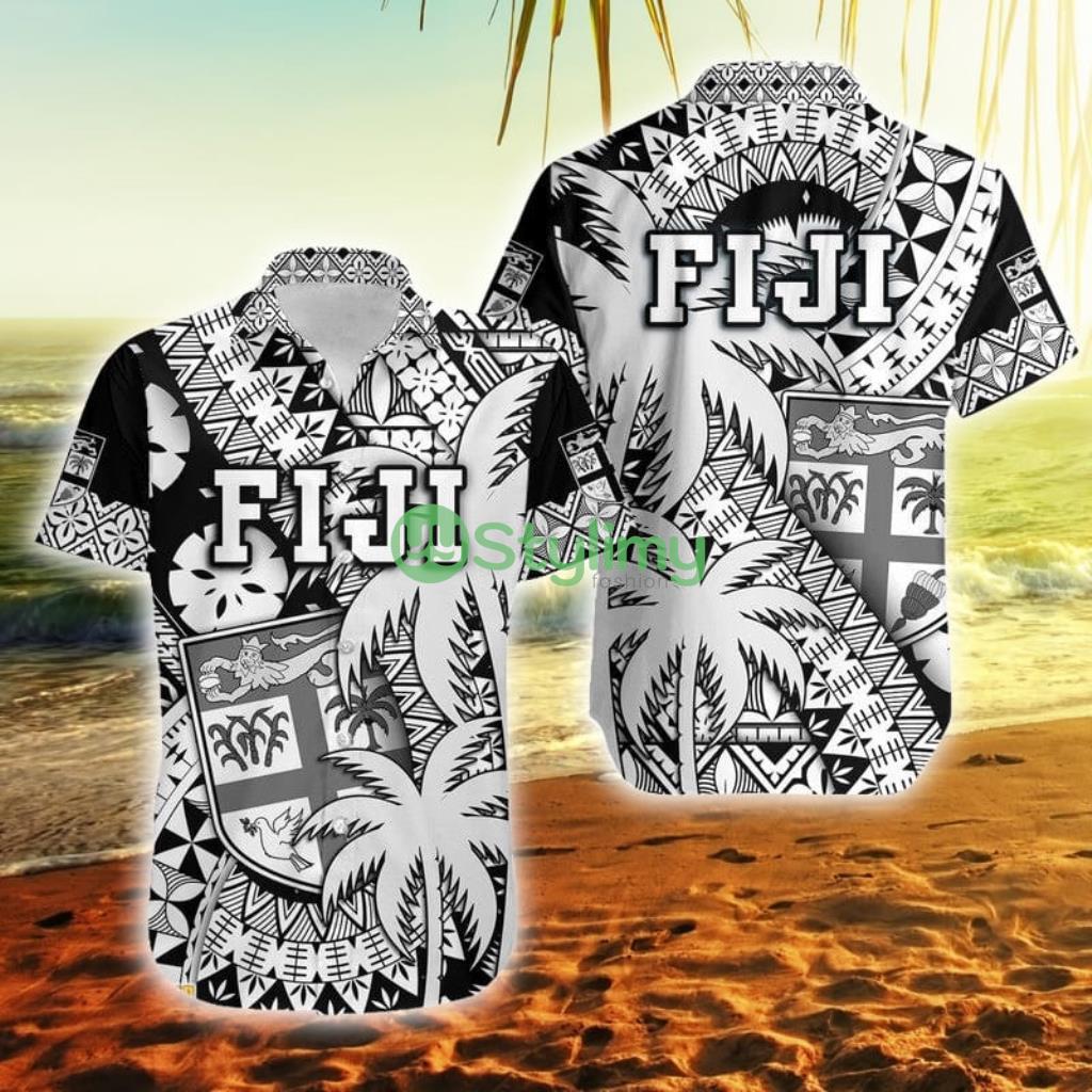 Fiji Coat Of Arms Masi Tapa Mixed Palm Tree No1 Black Version Fiji Button Down Hawaiian Shirt Trending Summer Details: