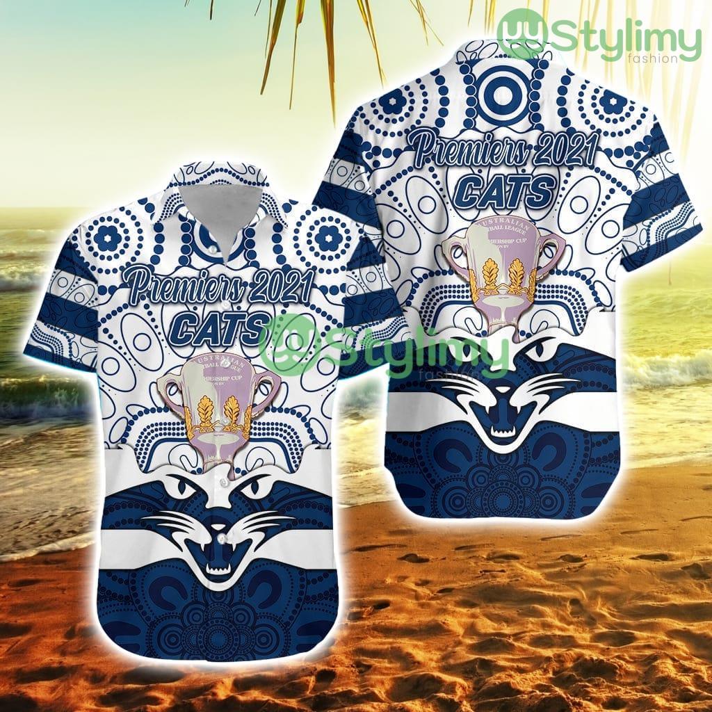 Some of the Geelong Cats Indigenous Hawaiian Shirt Football Premiers Trophy Trending Summer photos