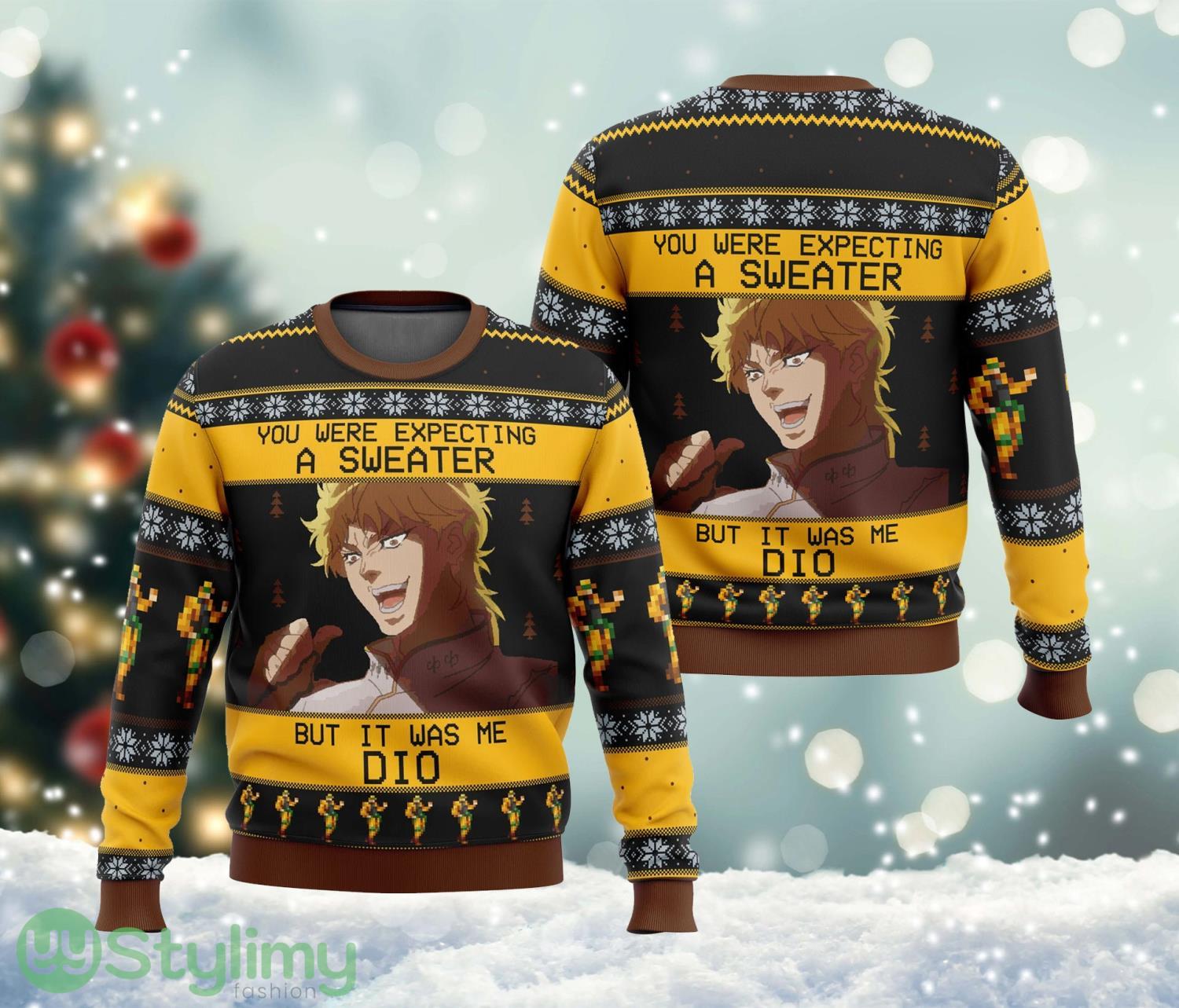 Celebrate the holiday season in true Jojo’s Bizarre Adventure style with our “It Was Me Dio” Ugly Christmas Sweater! This adorable and quirky sweater is the perfect gift for your entire family, spreading joy and laughter during this festive time. Featuring an eye-catching design inspired by the iconic Dio Brando, this sweater is a must-have for any Jojo’s fan.