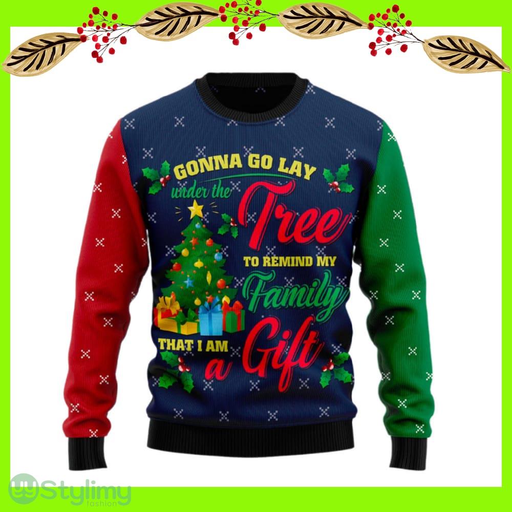 Not only is this sweater a fashion statement, but it also serves as a heartwarming reminder of the love and joy you bring to your family. The playful message “Lay Under Tree Remind My Family I am A Gift” is a delightful way to show your loved ones how much you cherish them during this special time of year.