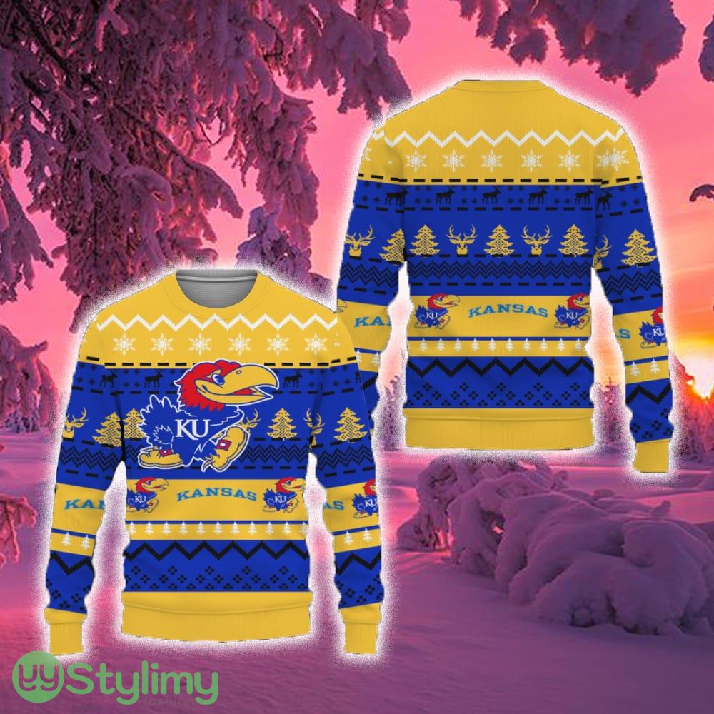 The eye-catching design features a delightful snow pattern against a vibrant background, making it a standout piece at any Christmas gathering. But what truly sets this sweater apart is the clever incorporation of the Kansas Jayhawks logo, adding a fun and playful touch to the festivities.
