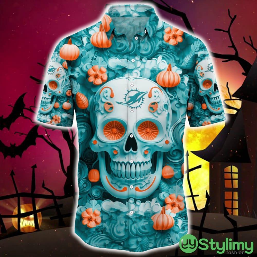 Miami Dolphins Halloween Pumpkin Skull 3D Hawaiian Shirt For Fans Gift Christmas Men And Women Details: