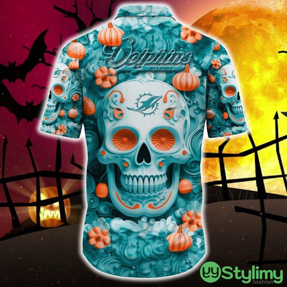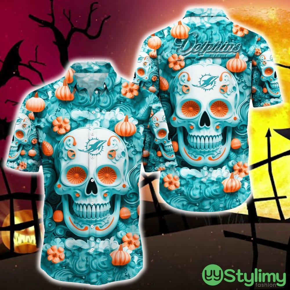 Embrace the spirit of the Miami Dolphins with our Halloween Pumpkin Skull 3D Hawaiian Shirt. Order yours today and stand out from the crowd with this one-of-a-kind fan gear!