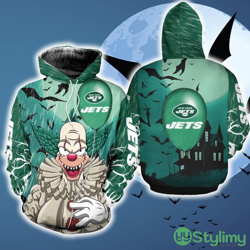 Perfect design for holiday. Get yours this shirt or this is a cute item for your daddy, gift for your mom, and gift for friends on any occasion. buy a cute New York Jets IT Color Halloween Skull Hoodie AOP For Men And Women Gift Fans now.