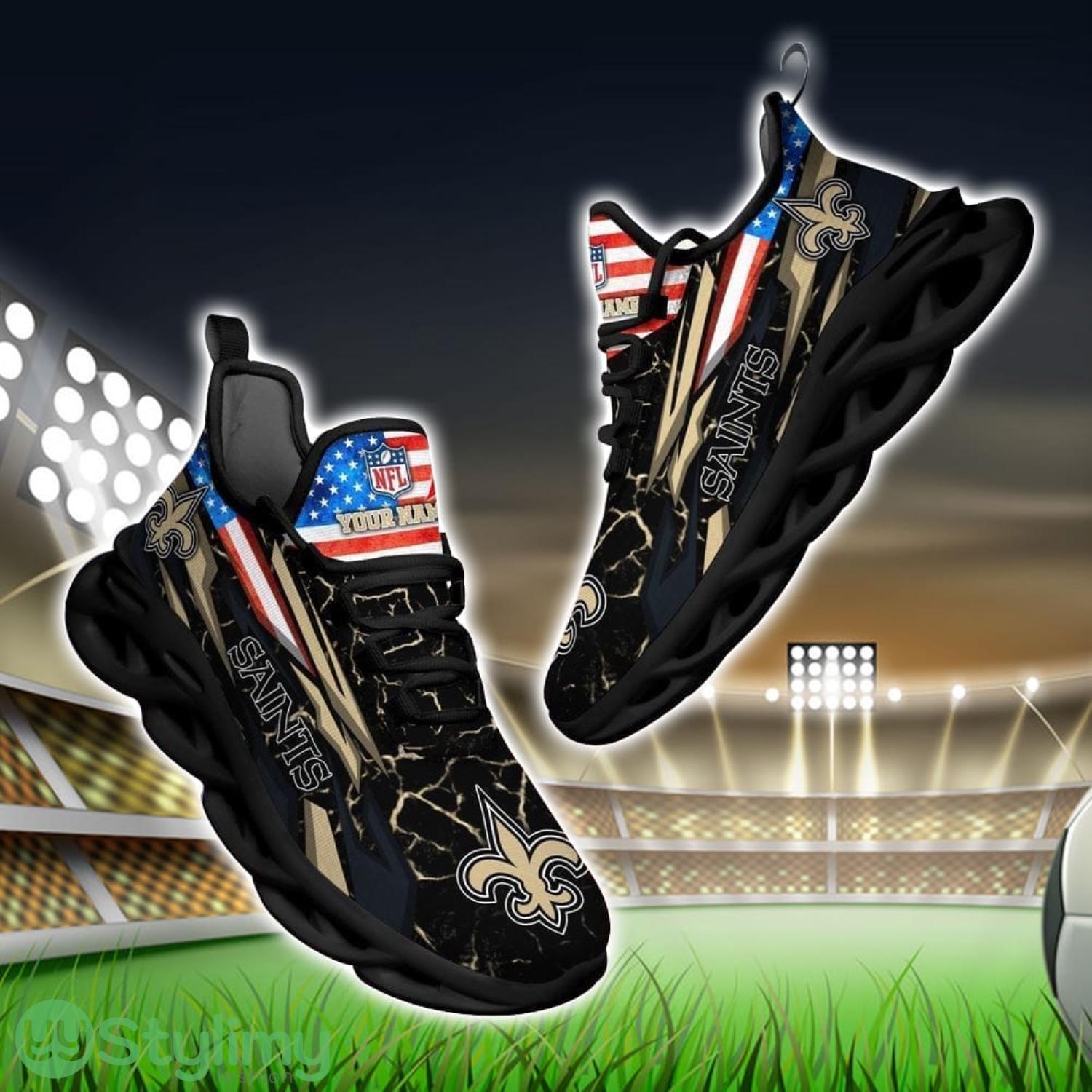Show off your love for the New Orleans Saints with these custom name Max Soul shoes! Featuring the iconic NFL logo and flag, these shoes are the perfect gift for any die-hard Saints fan. Personalize them with your own name or the name of your favorite player for a unique touch. Step out in style and represent your team with pride in these one-of-a-kind kicks. Perfect for game day or everyday wear, these shoes are sure to turn heads and show off your team spirit. Order yours today and elevate your fan gear to the next level!