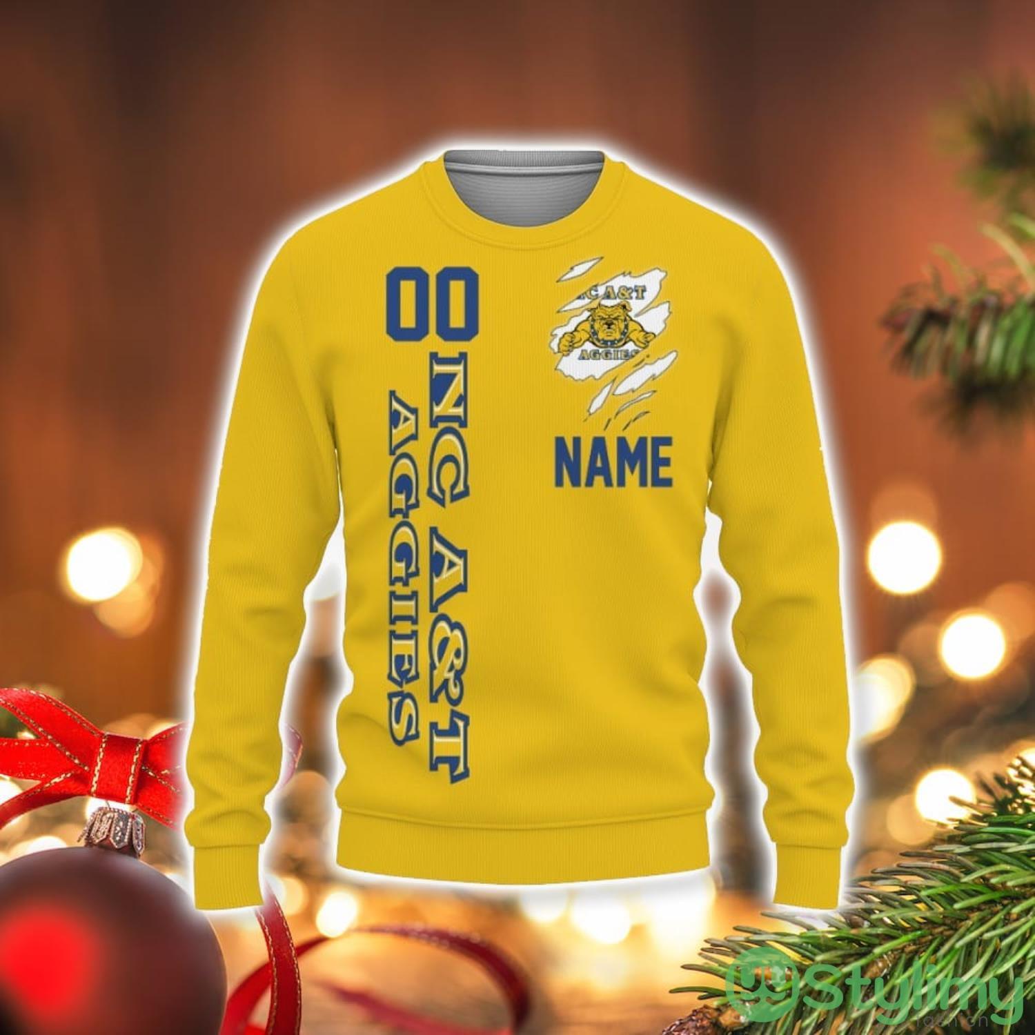 Don’t miss out on this limited edition sweater! Order now and join the ranks of proud Aggies fans who proudly display their team pride. Elevate your holiday gifting game with this remarkable North Carolina AT Aggies Sports American Football Helmet New Trends For Fans Club Gifts Unisex 3D Sweater.