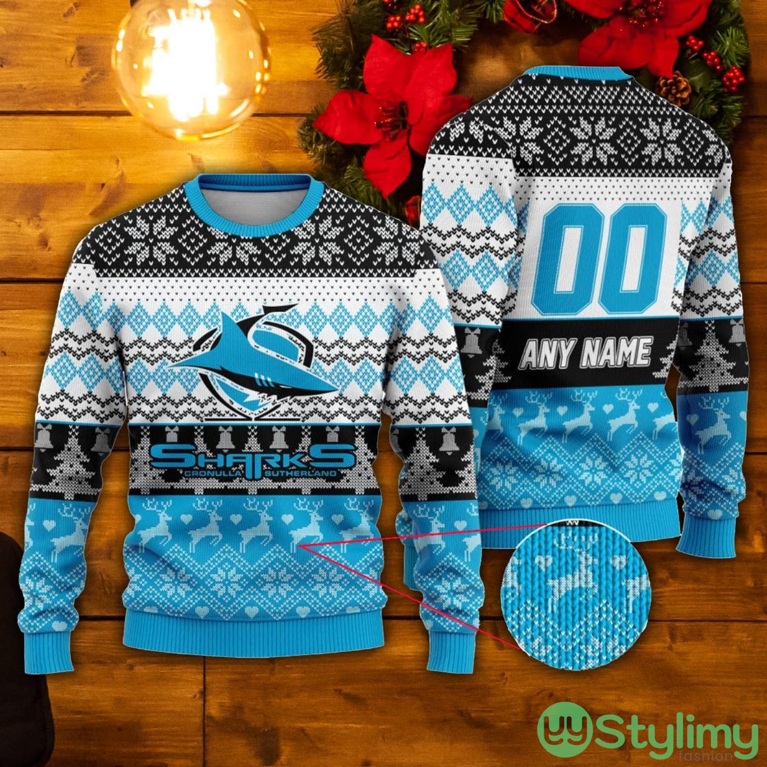 Some of the NRL Cronulla-Sutherland Sharks Custom Name & Number Ugly Christmas Sweater photos