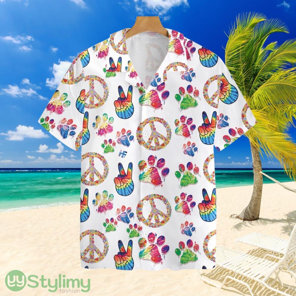 The colorful Hawaiian print showcases a delightful combination of the iconic peace sign, love symbol, and adorable dog motifs, creating a unique and captivating design that will turn heads wherever you go. Whether you’re a dog lover or simply appreciate the charming aesthetics of Hawaiian fashion, this shirt is sure to become your go-to piece for any occasion.