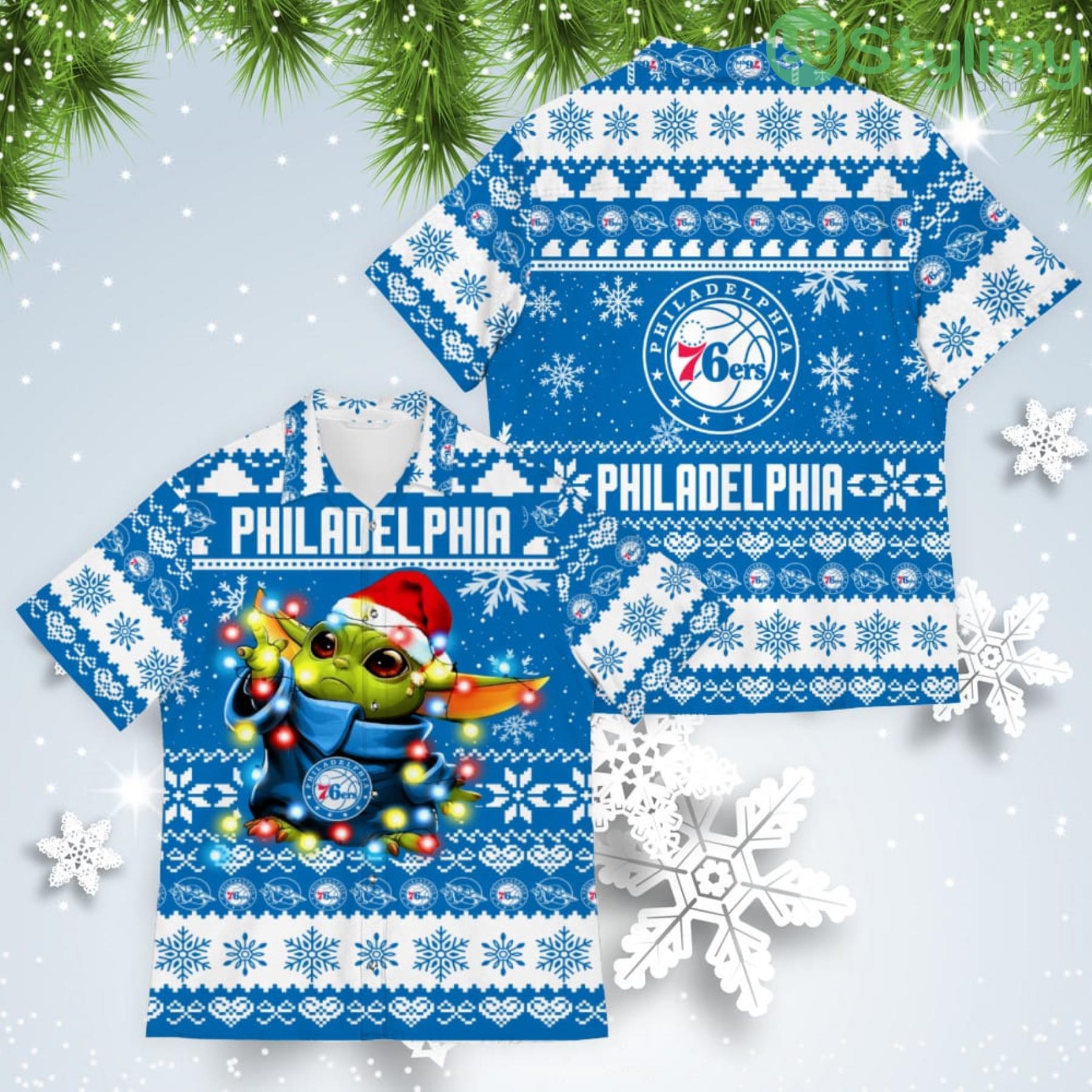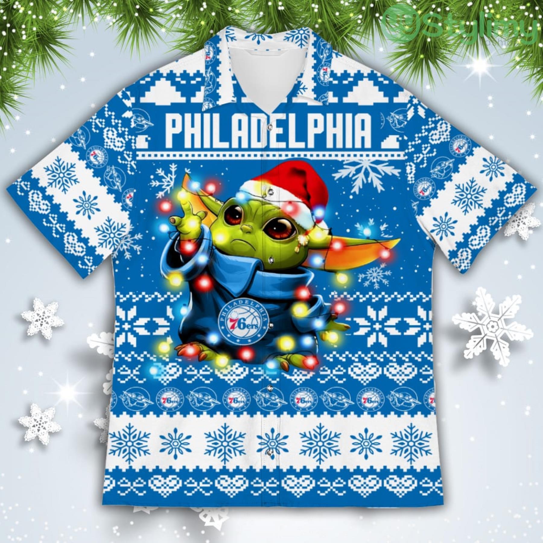 Philadelphia 76ers Baby Yoda Star Wars American Ugly Christmas Sweater Pattern Hawaiian Shirt Details: