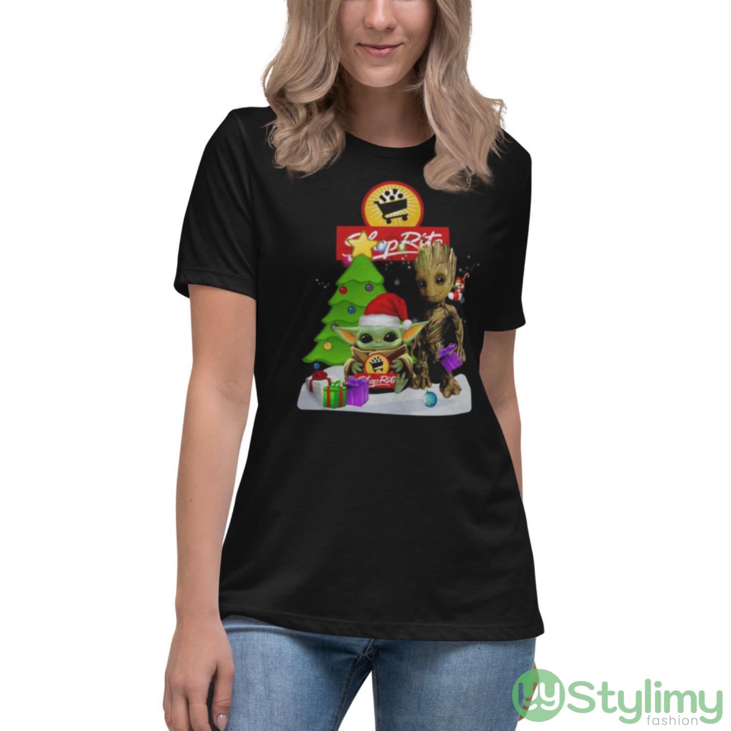 Santa Bigfoot And Baby Yoda Hug Shoprite Snow Christmas Tree Shirt Details