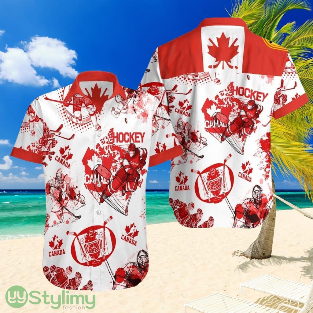 Crafted with the utmost attention to detail, this shirt features a captivating design that seamlessly blends tropical elements with iconic Canadian hockey motifs. The lush Hawaiian scenery is beautifully intertwined with the fierce determination of Canada’s hockey players, creating a visually striking masterpiece.