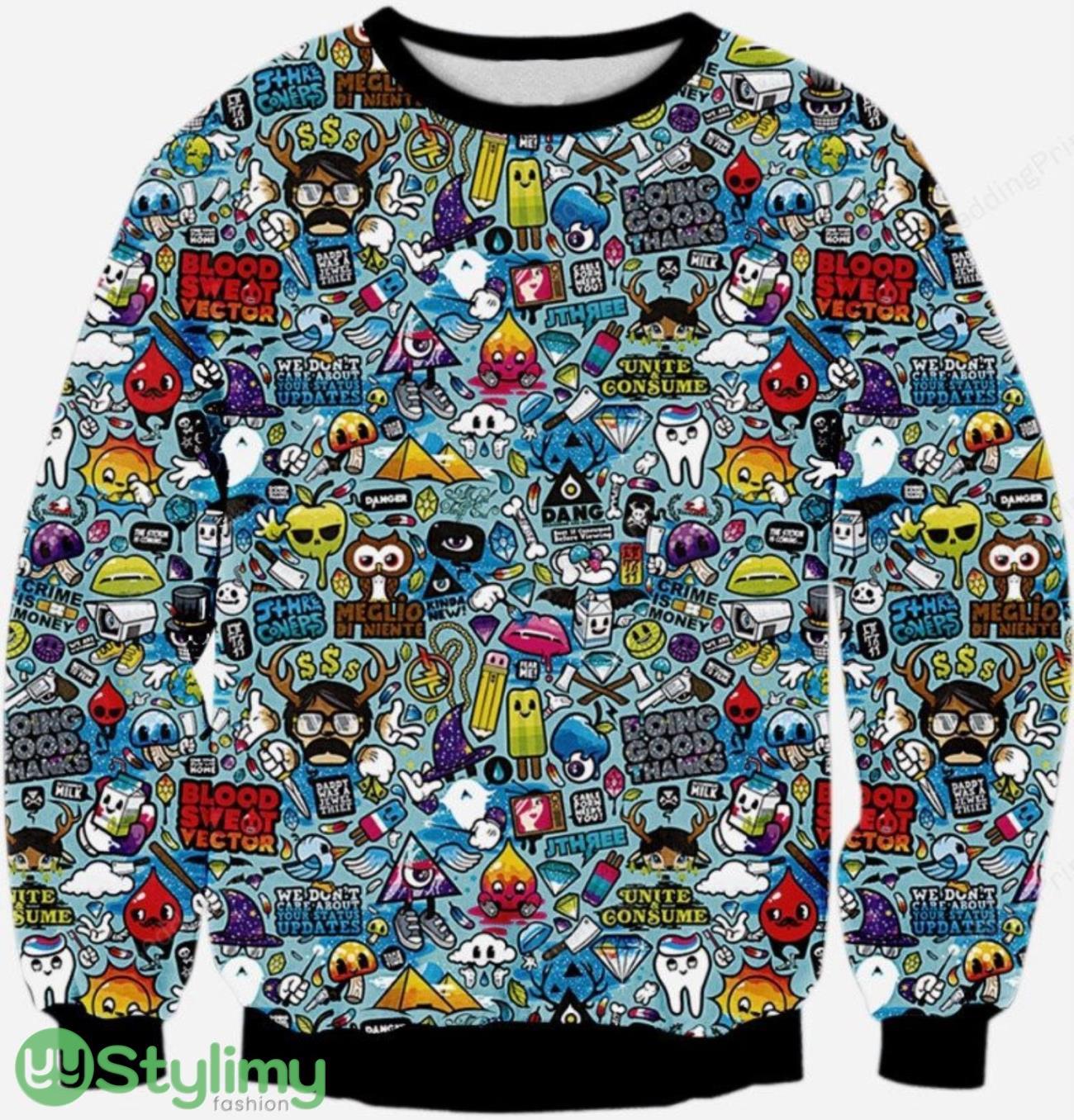 Wacky Cartoon Sketch Mashup 3D Ugly Christmas Sweater Christmas Gift Informations: