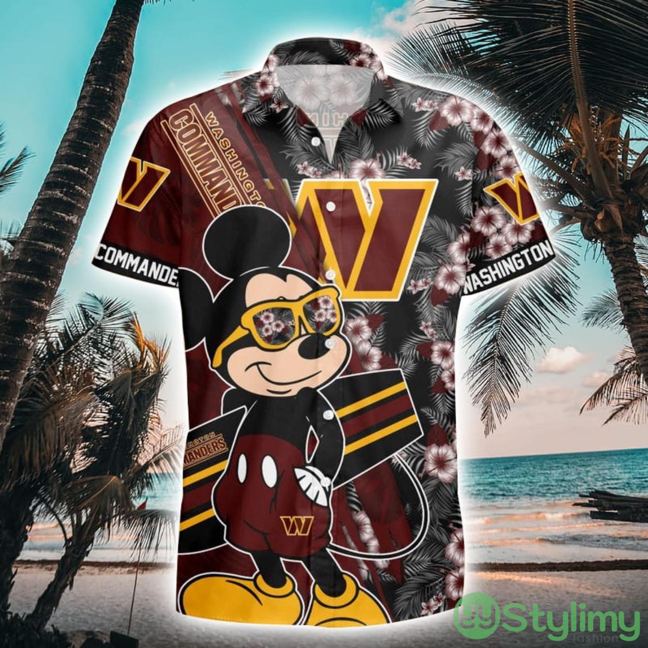 Crafted with meticulous attention to detail, this shirt features a vibrant all-over print that showcases the iconic Washington Commanders logo alongside the beloved Mickey Mouse riding the waves. The combination of these two legendary symbols creates a unique and captivating design that is sure to turn heads wherever you go.